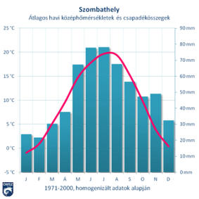Vas megye, így Szombathely is hazánk egyik legkiegyenlítettebb klímájú területe annak köszönhetően, hogy idáig még elérik az Atlanti-óceán páradús légtömegei, melyek az Alpok hatásával társulva kiegyenlített éghajlatot eredményeznek.Szombathely területén az évi középhőmérséklet 9,5 C`,acsapadékmennyisége 614 mm, a napsütéses órák száma pedig 1800. A csapadék maximuma általában júliusban jelentkezik 78 mm átlaggal, a minimum pedig januárban 24 mm átlaggal.A szél uralkodóan északi..